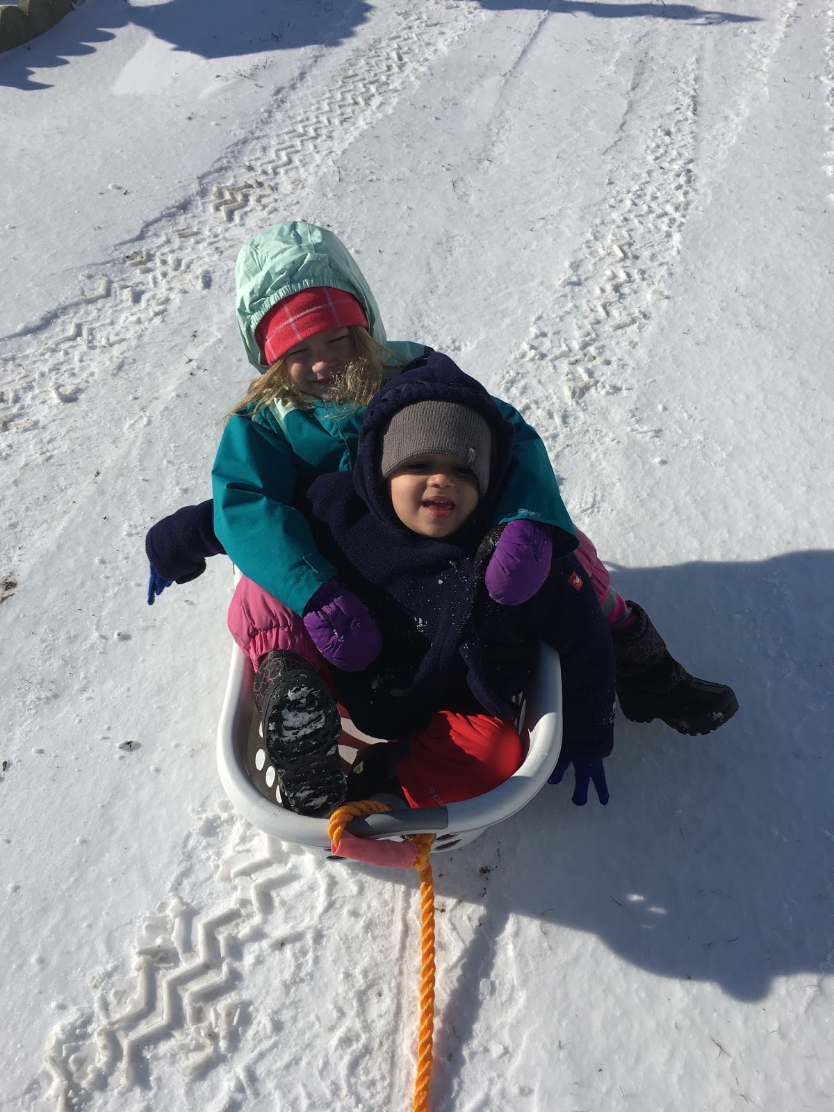 We went over to Nanny's house and hooked an old clothes basket to the golf card for a fun time of sledding!